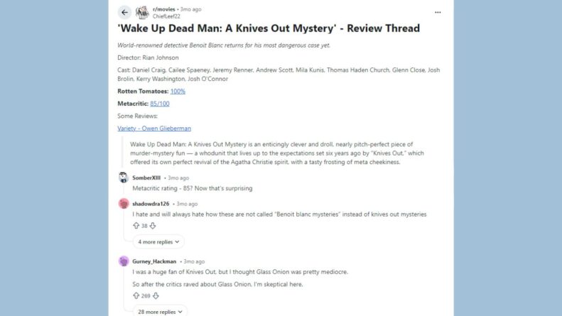 Reviews say the movie is bigger than Knives Out but not as sharp as Glass Onion, and many feel it doesn’t have the tight, focused writing of the first film. It also plays it safe, leaning on well-worn mystery tropes rather than attempting to surprise or outsmart its audience.